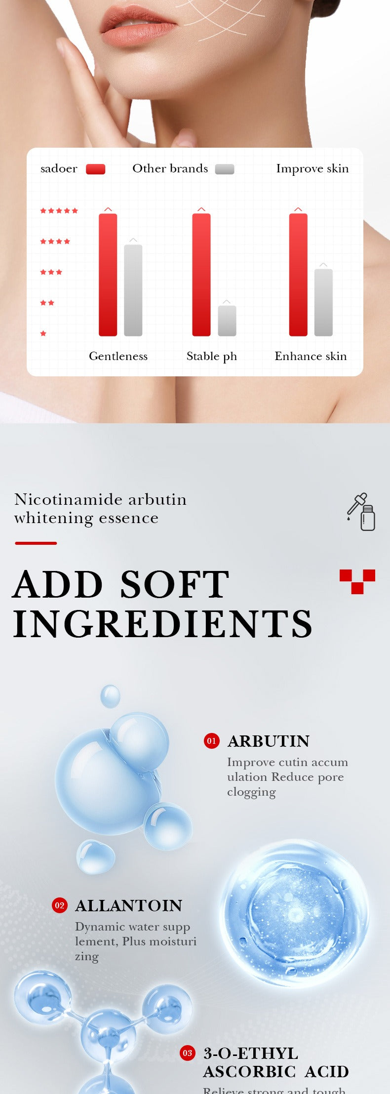Achieve visibly brighter, glowing skin with Sadoer Arbutin White Serum . Powered by Niacinamide (Vitamin B3) and Arbutin , this gentle formula fades dark spots, evens skin tone, and gives you a radiant, healthy glow — without irritation.
